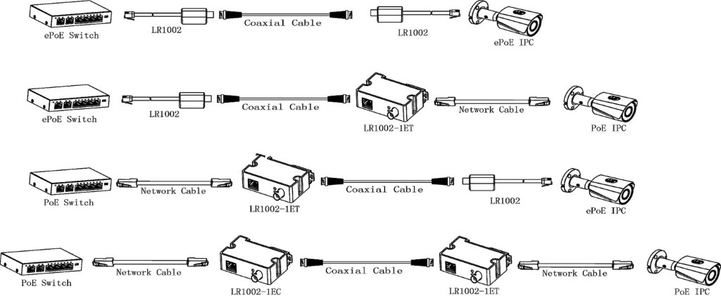Protože i fyzikální možnosti UTP/FTP a koaxiálních kabelů mají své limity, přichází Dahua výrobce s novou technologií modulace, celý standard je založen na podpoře ze strany ePoE switche a ePoE kamery. Pokud jedno ze zařízení nebo žádné z nich nemá podporu tohoto standardu, jsou k dispozici dva typy převodníků pro koaxiální kabel (LR1002, LR1002-1ET a 1EC). Výrobcem zaručená přenosová trasa pro signál i napájení dosahuje neuvěřitelných 800 m při postupném úbytku napájecího výkonu.