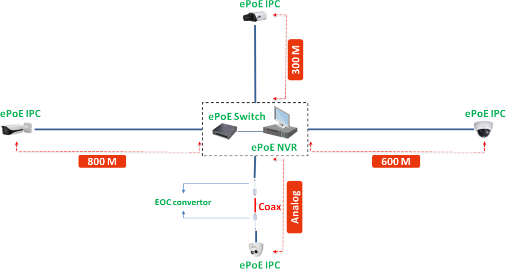 Dahua technologie ePoE je tedy dobrým řešením pro mnoho složitých instalací s trasami nad 100 m běžné datové kabeláže, ale také se nabízí jako možná volba pro revitalizaci analogových kamerových systémů vedených po koaxiálních trasách.