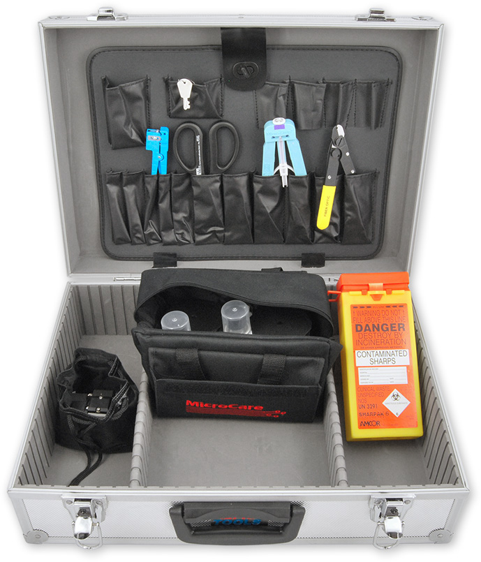 Nabízíme Vám zapůjčení lamačky optických vláken a základního nářadí pro odizolování a ukončení optického vlákna. Součástí sady nářadí jsou kleště zdrhovací (250 um nebo 900 um), klasické zdrhovací kleště (250 um), stripovací kleště pro průměry 3 - 3,5 mm, nůžky na kevlar, kompletní sada na čištění optiky, uzavíratelný plastový box na odlomená vlákna, robustní aluminiový kufřík na nářadí.