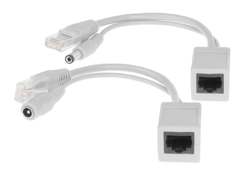 Sada pasivního PoE splitteru a pasivního PoE injektoru pro připojení IP zařízení datovým kabelem, data na pinech 1,2,3,6, napájení na pinech 4,5,7,8, vstupní/výstupní napájení max.57 V= (zdroj není součástí).