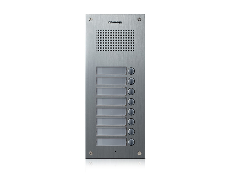 8-tlačítková dveřní stanice pro systém 4+n. Čelní panel z eloxovaného hliníku s podsvícenými tlačítky a popisnými štítky. Možnost rozšíření o tlačítkové panely DR-nUS. Dveřní stanici lze použít s ochrannou stříškou S-7P nebo s povrchovou instalační krabičkou S-7N.