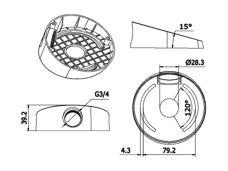 Zkosená montážní patice pro dome kamery pod úhlem 15°. Rozměry: průměr 111 x 40mm. Bílá barva.