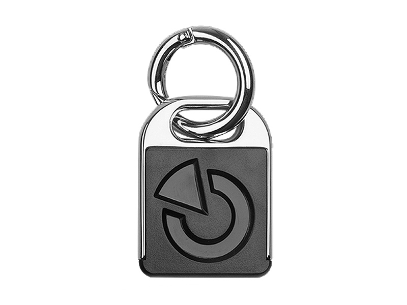 Přístupový čip k systému JABLOTRON 100+ ve tvaru přívěsku na klíče v černém provedení z kovu a odolného plastu.