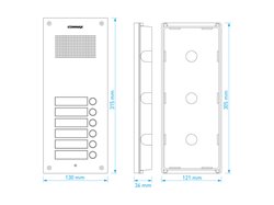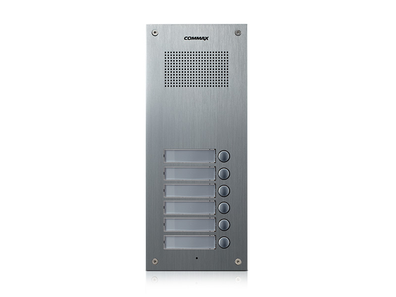 6-tlačítková dveřní stanice pro systém 4+n. Čelní panel z eloxovaného hliníku s podsvícenými tlačítky a popisnými štítky. Možnost rozšíření o tlačítkové panely DR-nUS. Dveřní stanici lze použít s ochrannou stříškou S-7P nebo s povrchovou instalační krabičkou S-7N.