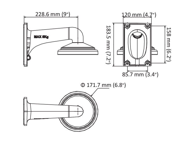 Konzole pro PTZ kamery na stěnu. Rozměry 171 x 158 x 229mm. Váha 1,12 Kg. Bílá barva.