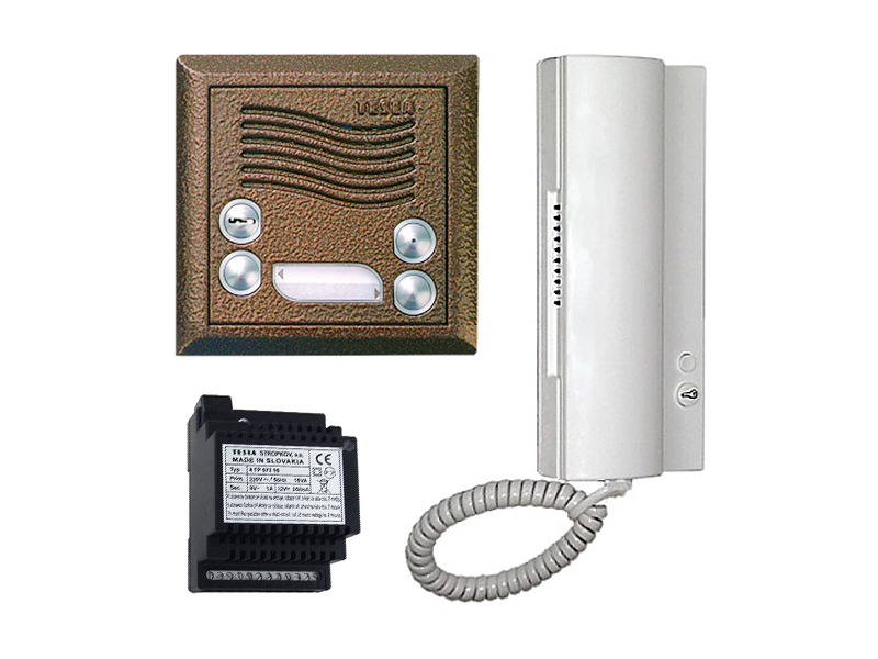 Audiosada KARAT 4+n s elektronickým vyzváněním pro 1 účastníka, antika měděná. Sada obsahuje 1ks elektrický vrátný + 1 ks domácí telefon + 1 ks síťový zdroj (umožňuje komunikaci s druhým domácím telefonem).