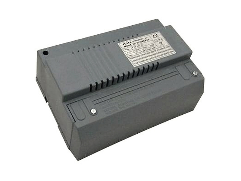 Síťový zdroj pro 2-BUS VIDEO i AUDIO. Výstupní napětí 24V/0,5A DC (stabilizované) pro videovrátník a videotelefony. 9V/1A AC pro střídavý elektrický zámek resp. 12V/0,5A DC (nestabilizované) pro stejnosměrný elektrický zámek.