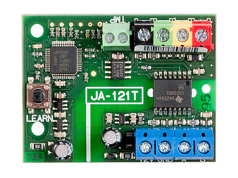 Modul JA-121T je univerzální převodník na RS-485 pro jiné systémy. Zprostředkovává převod ze sběrnice systému JABLOTRON 100+ do sériové linky RS-485 a zpět. Použití například pro spojení s inteligentním domem. Obsahuje obvody galvanického oddělení dimenzované na zkušební napětí 4kV. Data jsou posílána při změně stavu nebo na vyžádání. V pasivním módu jsou všechna data posílána pouze na vyžádání. Modul je adresovatelný a obsazuje v systému jednu pozici.