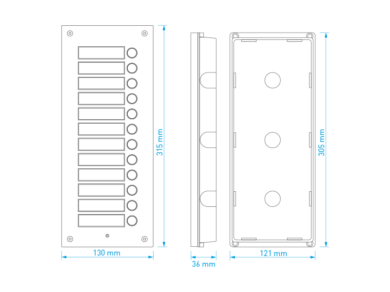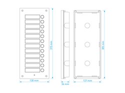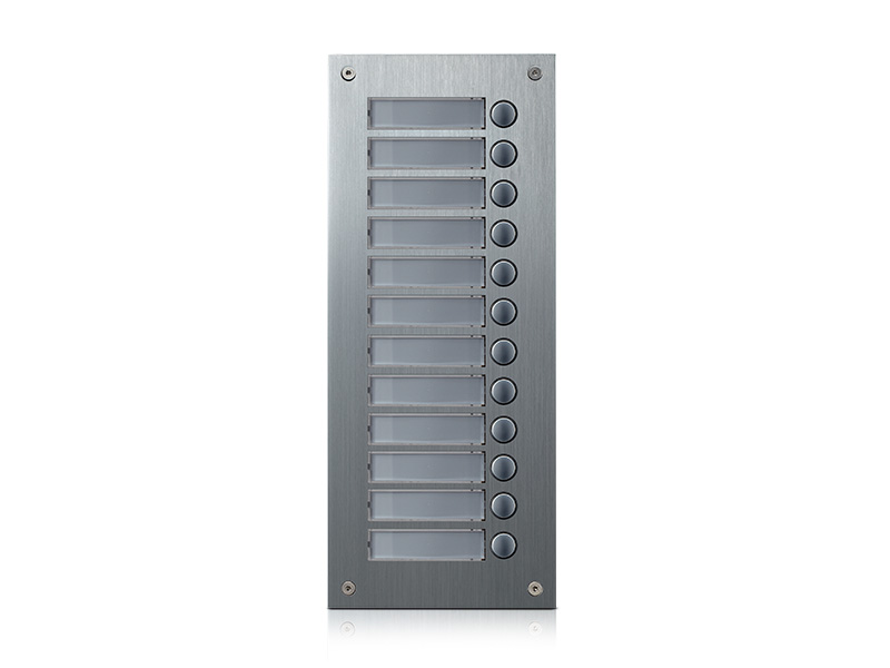 Rozšiřující 12-tlačítkový panel pro systém 4+n. Čelní panel z eloxovaného hliníku s podsvícenými tlačítky a popisnými štítky. Možnost zapojení více rozšiřujících tlačítkových panelů za sebou. Tento panel lze použít s ochrannou stříškou S-7P nebo s povrchovou instalační krabičkou S-7N. Zápustná instalační krabička je součástí dodávky.