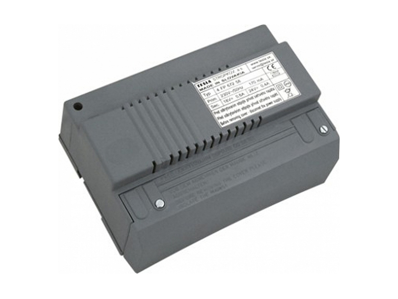 Síťový zdroj pro BUS VIDEO i AUDIO. Výstupní nápětí 18V/0,6A DC (stabilizované) pro videotelefony a 24V/0,5A DC (stabilizované) pro videovrátník).