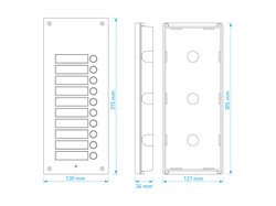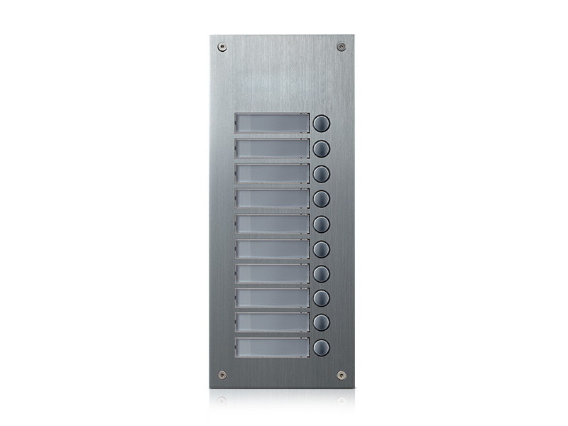Rozšiřující 10-tlačítkový panel pro systém 4+n. Čelní panel z eloxovaného hliníku s podsvícenými tlačítky a popisnými štítky. Možnost zapojení více rozšiřujících tlačítkových panelů za sebou. Tento panel lze použít s ochrannou stříškou S-7P nebo s povrchovou instalační krabičkou S-7N. Zápustná instalační krabička je součástí dodávky.