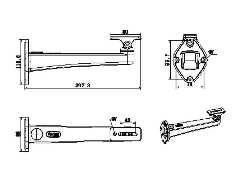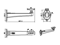 Univerzální kovová konzole na stěnu s průchodkou pro kabel. Možnost natočení: horizontálně 360°, vertikálně -45° ~ +45°. Rozměry: 88×117×297mm