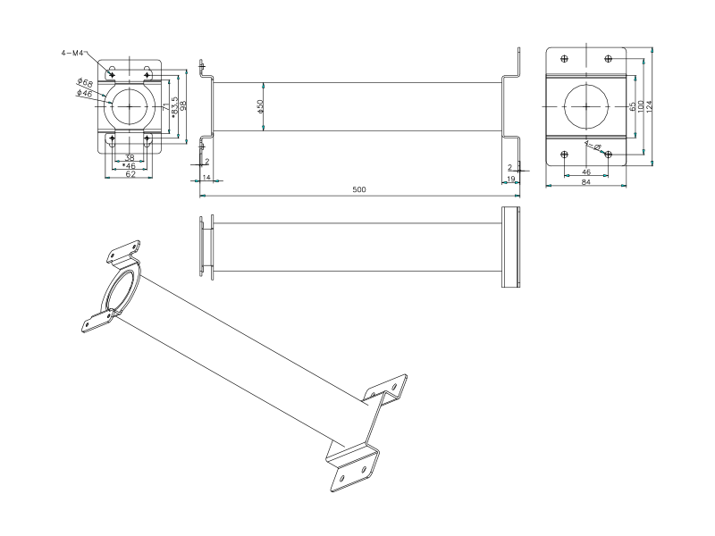 Konzole pro mini PTZ kamery na strop. Střední varianta. Pro kamery řady DS-2DE4AxxxIW-DE. Rozměr základny: 84 x 124mm. Délka konzole 500 mm. Bílá barva.