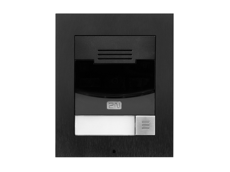 Kompaktní IP interkom, 1 tlačítko, skrytá HD kamera, IR přísvit, přijímání hovoru na telefon, snadná integrace do Home Automation systému, montáž na povrch. Černá barva.