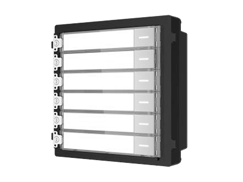 Modul se šesti zvonkovými tlačítky a prostornými jmenovkami; v nočním režimu jsou jmenovky podsvětleny; nevyužité tlačítko je možné zaslepit (balení obsahuje 4 záslepky) ; určeno pro IP systém i 2-vodičový systém.