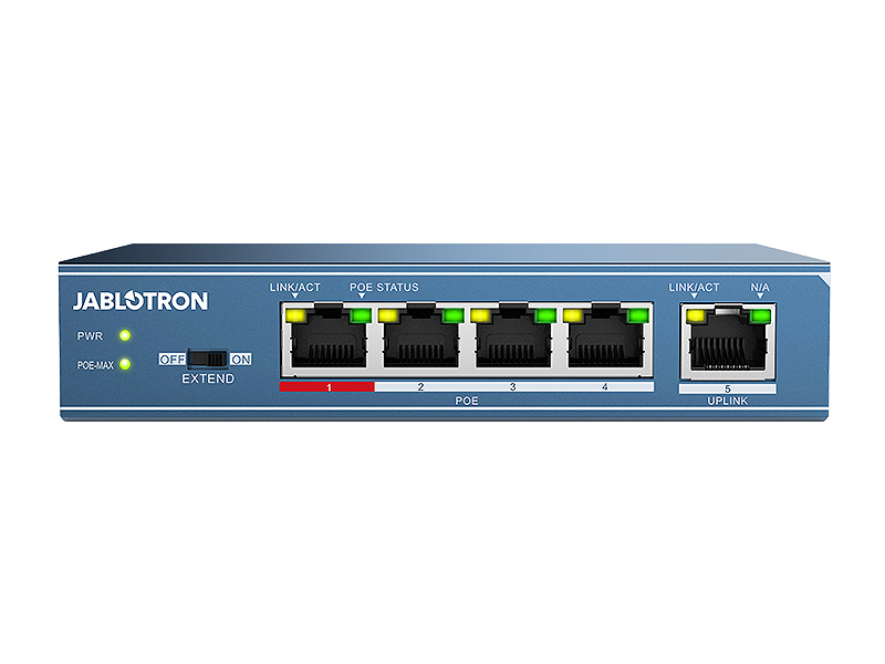 Rozbočovač Ethernetu slouží k snadnému a rychlému rozšíření lokální sítě LAN. Je vybaven čtyřmi výkonnými porty PoE pro datové připojení a napájení IP kamer JABLOTRON jedním kabelem. Rozbočovač podporuje sítě s rychlostí jak 10 Mbps tak i 100 Mbps.