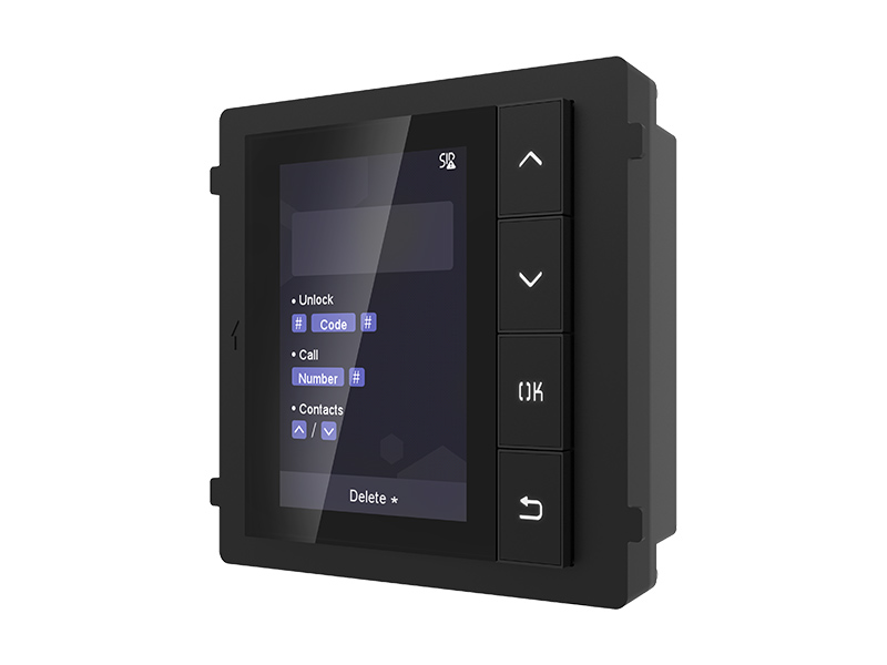 Modul s barevným 3,5" LCD displejem pro modulární systém videotelefonů Hikvision 2. generace; zobrazuje aktuální činnost systému nebo umožňuje zobrazit jmenný seznam účastníku s možností jejich výběru a zazvonění; ovládání je prováděno pomocí čtyřech bočních tlačítek; v nečinnosti je tento modul zhasnutý; určeno pro IP systém i 2-vodičový systém.