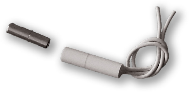 Dvoudrátový menší závrtný magnetický kontakt určený pro zápustnou montáž do oken, dveří atd..