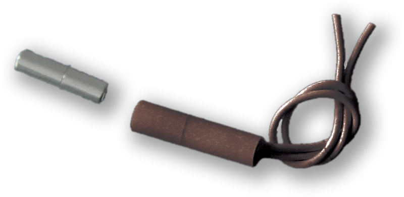 Dvoudrátový menší závrtný magnetický kontakt určený pro zápustnou montáž do oken, dveří atd..