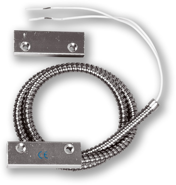 Masivní povrchový magnetický kontakt, určený pro povrchovou montáž na velká vrata, drátové vývody v pancéřové chráničce.