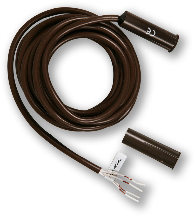 Čtyřdrátový závrtný magnetický kontakt, s rozšířenými koncovkami, určený pro zápustnou montáž do oken a dveří.