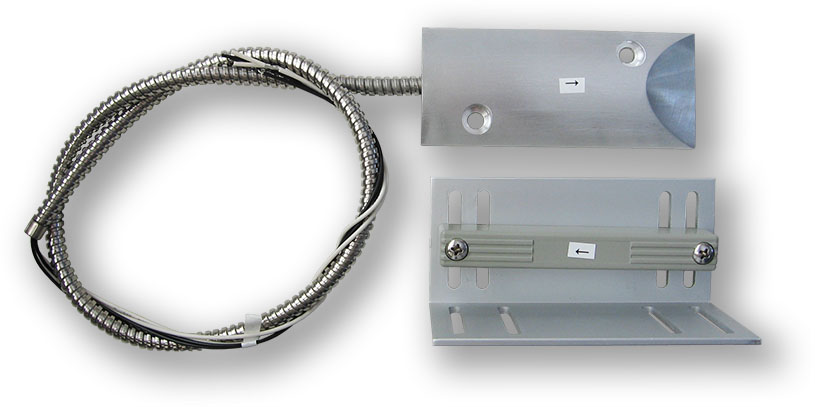 Čtyřdrátový magnetický kontakt polarizovaný, v masivním provedení, určený pro povrchovou montáž na velká vrata a průmyslové použití s většími rozměry. Drátové vývody v pancéřové chráničce, možnost přejezdu autem, součástí balení je montážní držák.