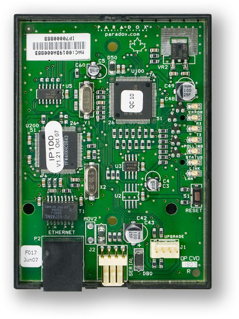 Modul určený pro komunikaci s ústřednami SP/MG/EVO přes LAN/INTERNET. Modul IP100 obsahuje web server a lze jej využít pro základní uživatelské ovládání, monitorovaní ústředny z libovolného PC v síti LAN/internet nebo k posílání emailů z ústředny při zapnutí/vypnutí, poplachu, poruše. Dále je možné modul využít pro plné programování instalační fi rmou dálkově přes LAN/internet pomocí SW WinLoad. V síti LAN/INTERNET je možné modul vyhledat.