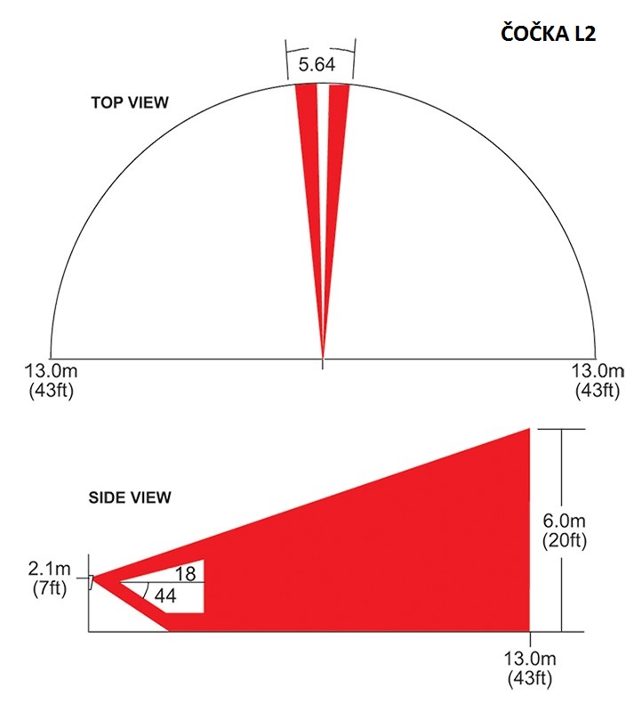 Venkovní bezdrátový digitální infrapasivní detektor pro venkovní použití, shodné vlastnosti jako detektor MG-PMD85, rozdíl je pouze v typu osazené čočky s odlišnou charakteristikou. MG-PMD85 verze L2: Charakteristika vertikální záclony. Vhodný pro hlídání chodeb, průchodů, úzkých pruhů v prostoru nebo pro rozdělení venkovního prostředí na části, mezi kterými je potřeba detekovat přechod. Detektor lze instalovat ve venkovním prostředí, není imunní vůči pohybujícím se zvířatům přecházejícím přes „záclonu“.