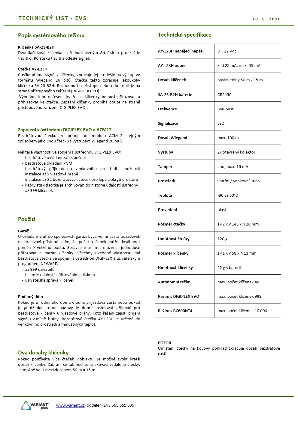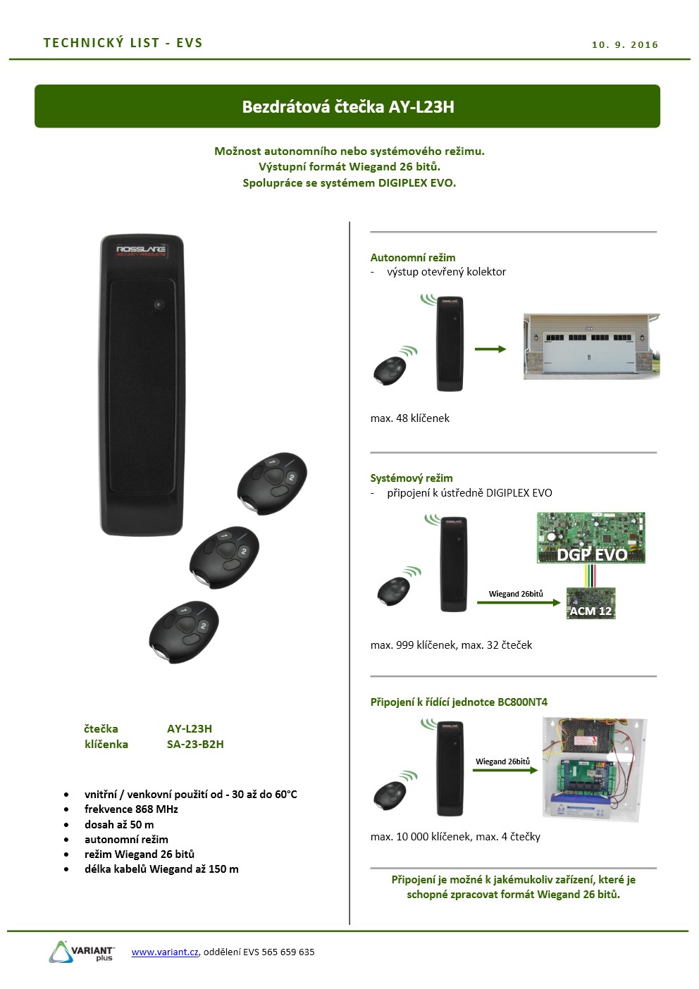 Vstup pro čtečku: ano, 1 vnitřní/venkovní čtečku RS485/Wiegand 26 bit