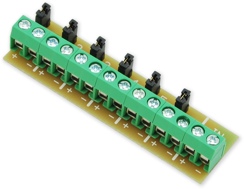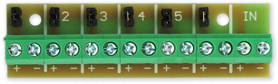 Přídavná svorkovnice pro mechanické rozšíření počtu napájecích svorek AUX s možností vyřazení jednotlivých okruhů pomocí propojek.