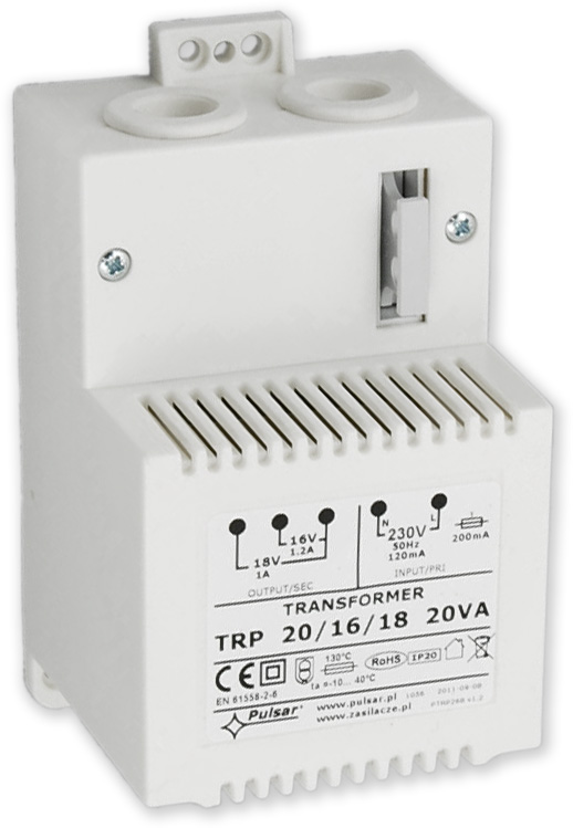 Transformátor 20 VA pro napájení ústředen s plastovým krytem zcela kryjícím "živé" části trafa, se svorkovnicí a tavnou pojistkou. Transformátor je možné přichytit 4 šrouby.