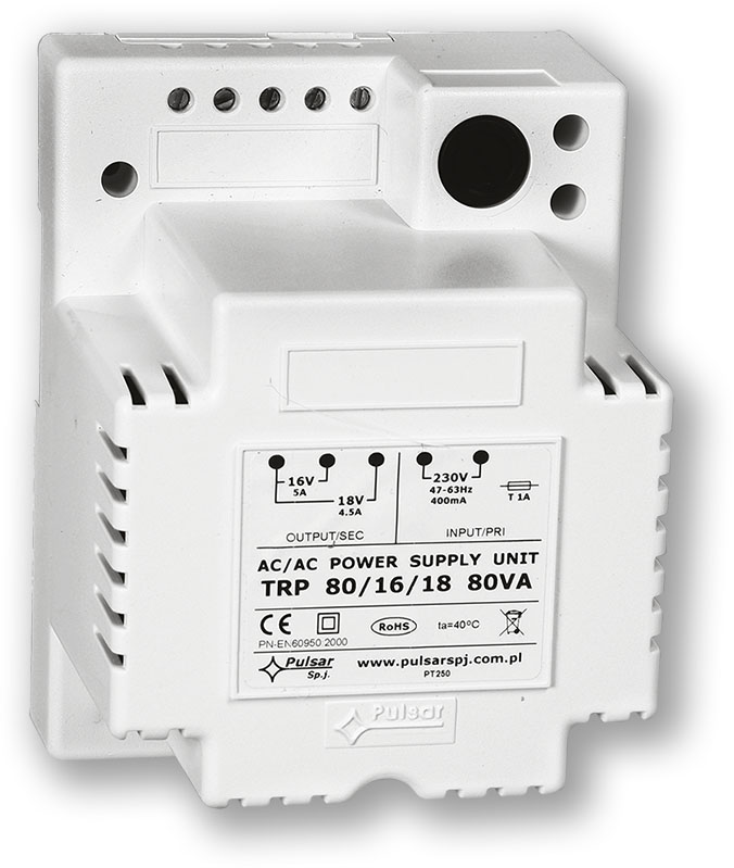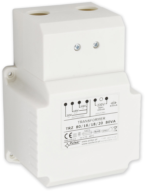 Transformátor 80 VA pro napájení ústředen s plastovým krytem zcela kryjícím "živé" části trafa, se svorkovnicí a tavnou pojistkou. Transformátor je možné přichytit 4 šrouby.