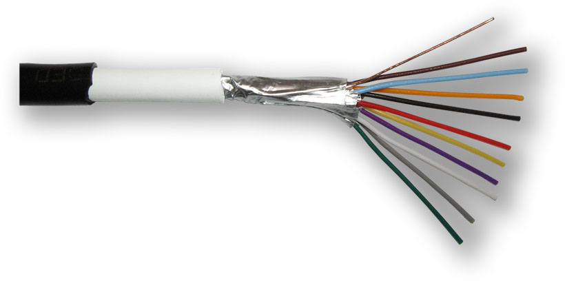 Stíněný kabel typu "drát", 10 žil pro venkovní použití, dvojitý plášť PVC + PE, průměr drátu 0,5 mm, pro slaboproudé rozvody EZS v balení po 300 m délky, značení délky na plášti kabelu.