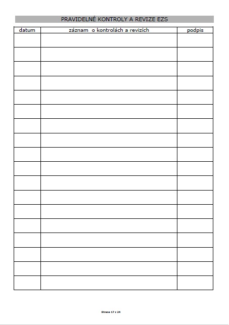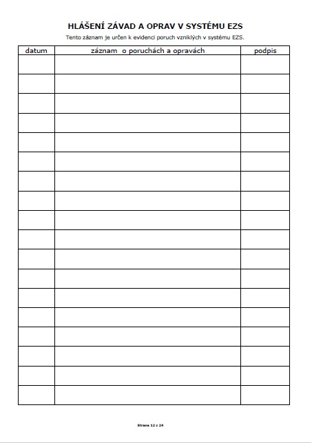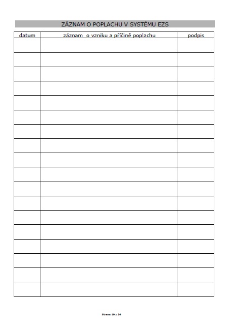 Tato kniha tvoří doporučenou součást dokumentace EZS, která je uložena u koncového uživatele na objektu a je určena pro evidenci významných událostí EZS. Je rozdělena na tři části – POPLACHY, PORUCHY a SERVIS. Každou část vyplňuje odpovědná osoba. V případě vzniku závažné události v objektu lze dohledat údaje o stavu EZS. Provozní kniha má výrazně průkaznou hodnotu při řešení problémů vzniklých technikou nebo obsluhou. Jedná se o univerzální výtisk – pro jakoukoliv ústřednu a systém.