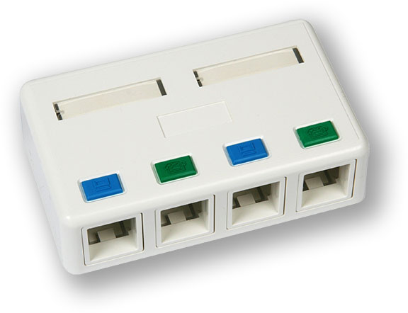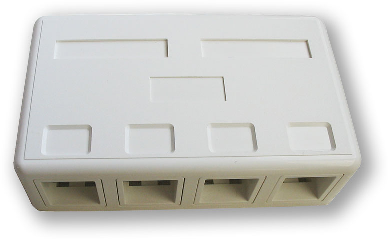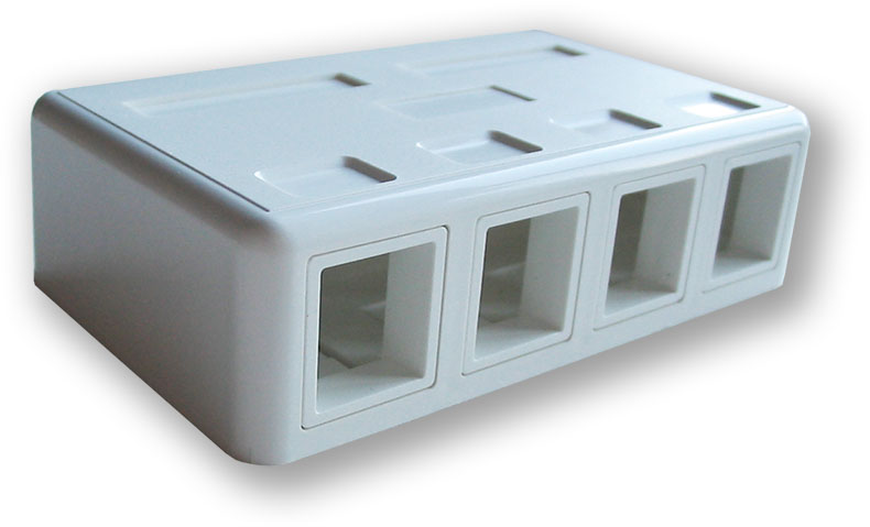 Povrchová neosazená datová zásuvka pro 4x keystone, oddělené 2 vstupy pro kabeláž, popisové pole pro každý keystone a pro každou dvojici keystonů.