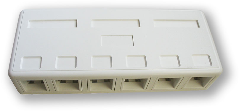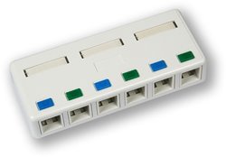 Povrchová neosazená datová zásuvka pro 6x keystone, oddělené 3 vstupy pro kabeláž, popisové pole pro každý keystone a pro každou dvojici keystonů.