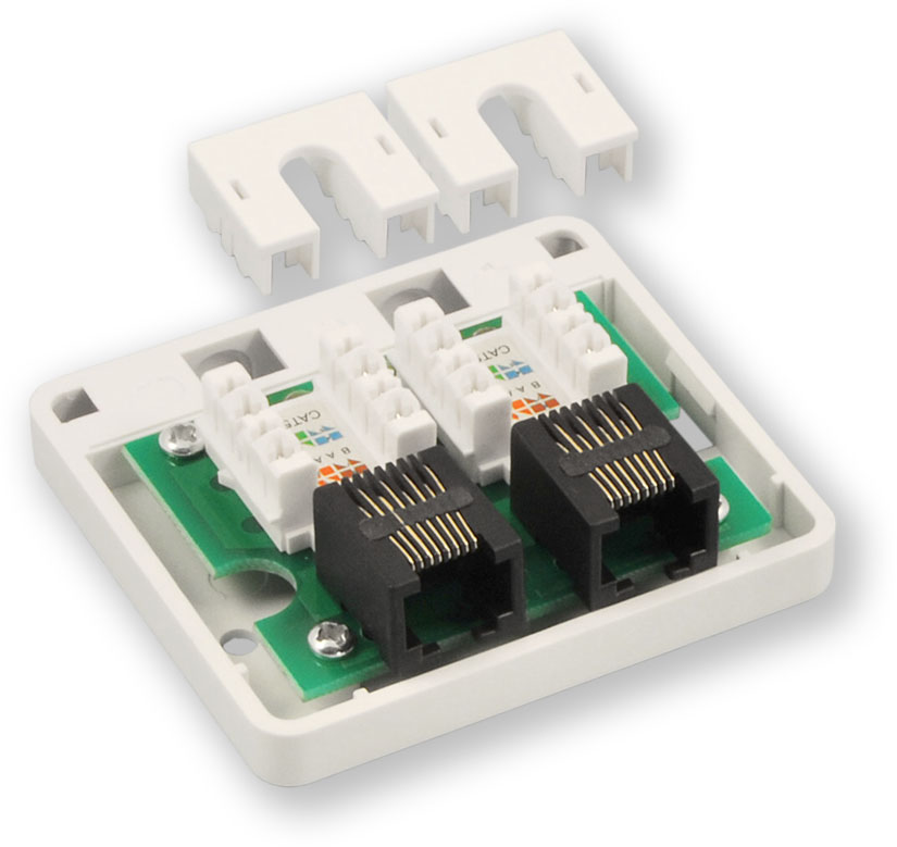 Povrchová datová zásuvka s 2 porty Cat.5e UTP a popisovým polem. Zásuvka je vybavena zářezovými svorkovnicemi typu LSA+ (Krone). K zapojení vodičů je nutné použít nástroje pro tento typ svorkovnice.