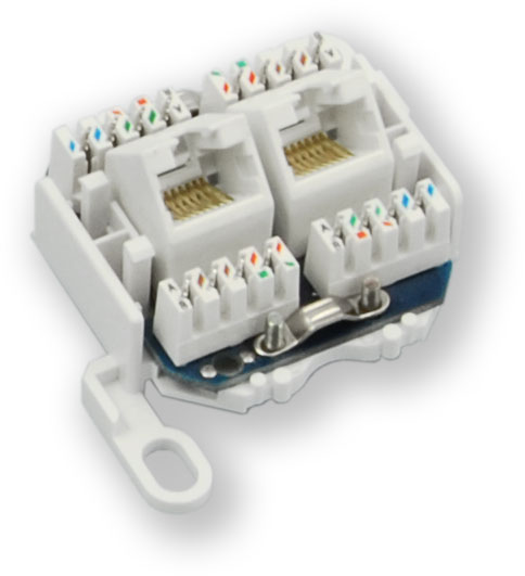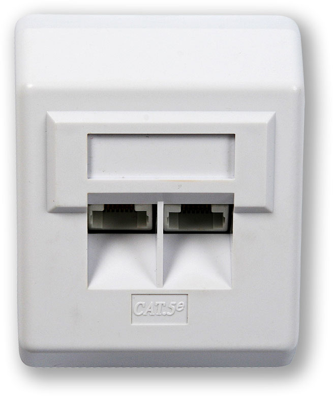 Povrchová datová zásuvka se 2 porty Cat.5e UTP. Zásuvka je vybavena zářezovými svorkovnicemi typu LSA+ (Krone). K zapojení vodičů je nutné použít nástroje pro tento typ svorkovnice.