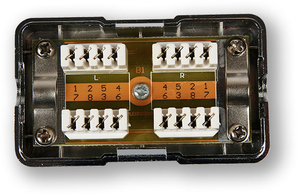Spojovací krabice Cat.6 STP se zářezovými svorkovnicemi typu LSA+ (Krone). K zapojení vodičů je nutné použít nástroje pro tento typ svorkovnice.