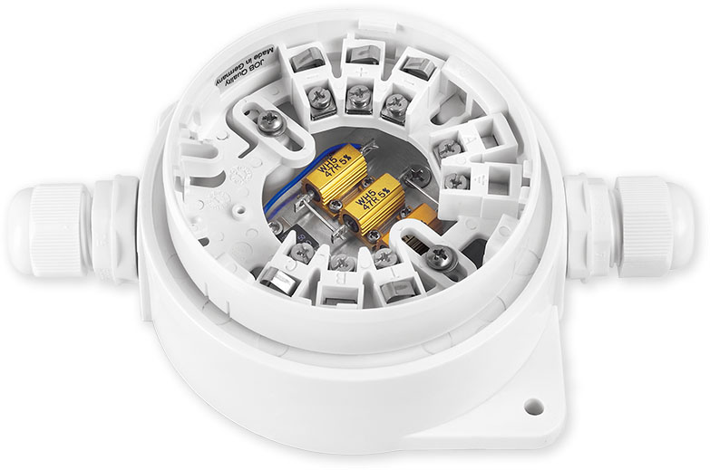 Kompletní svorkovnice APS pro hlásiče série 3000 PL i CT s vyhřívacím tělískem (udržuje teplotu asi 50°C). Vhodná pro použití v prostorách s možností kondenzace (chladírny). Vyžaduje externí napájecí zdroj 24 V, příkon topného tělíska cca 4 W (160 mA). Vývody jsou opatřeny průchodkami M20.