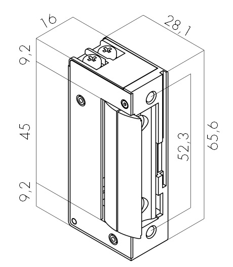 Elektromechanický zámek, který propouští přes horní západku běžného zámku a montuje se do zárubní dveří. Po přivedení napětí odemčeno. Součástí dodávky je čelní panel, který slouží pro uchycení zámku do zárubní.