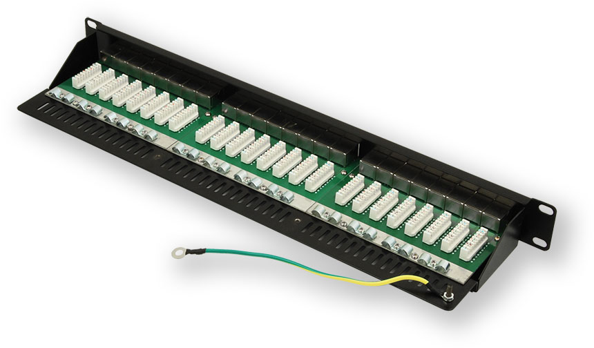 19" patch panel do datového rozvaděče s 24 porty Cat.5e STP s vyvazovací lištou pro kabeláž. Patch panel je vybaven zářezovými svorkovnicemi typu LSA+ (Krone). K zapojení vodičů je nutné použít nástroje pro tento typ svorkovnice.