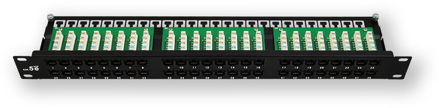 19" patch panel do datového rozvaděče s 48 porty Cat.5e UTP s vyvazovací lištou pro kabeláž. Patch panel je rozdělen na 2x 24 portů ve dvou řadách nad sebou, vrchní pole je možné demontovat a zapojovat samostatně. Patch panel je vybaven zářezovými svorkovnicemi typu LSA+ (Krone). K zapojení vodičů je nutné použít nástroje pro tento typ svorkovnice.
