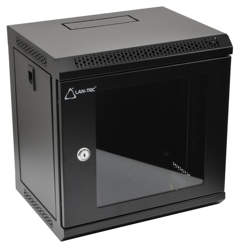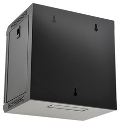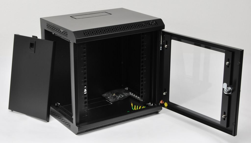 10" nástěnný datový rozvaděč se skleněnými dveřmi a odnímatelnými bočnicemi. Pevná svařovaná konstrukce, skelet z ocelového plechu, černá barva. Vhodné pro malé sítě a jednoduchá domácí řešení.