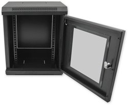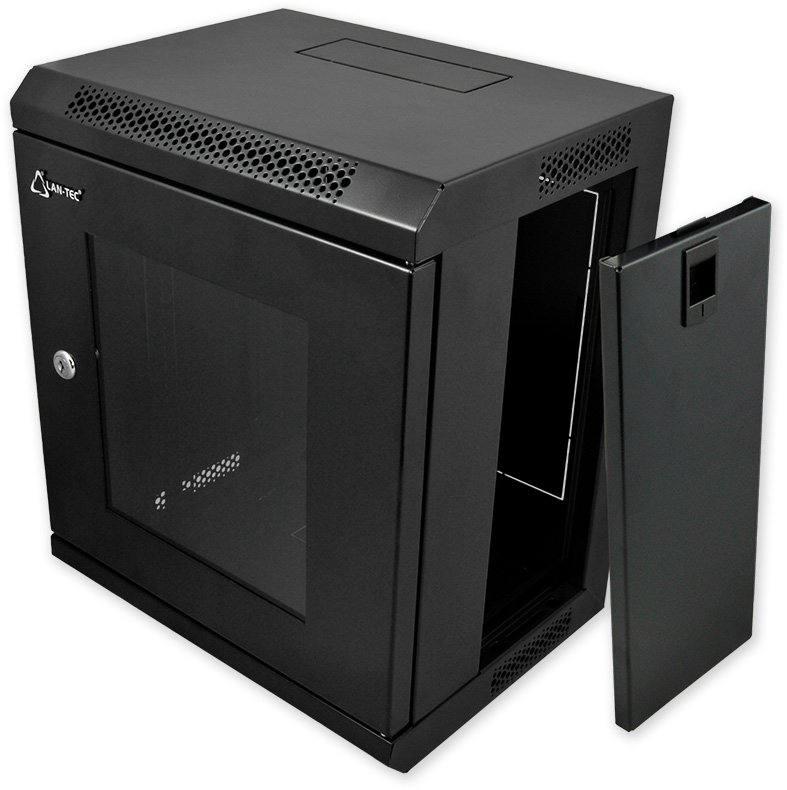 10" nástěnný datový rozvaděč se skleněnými dveřmi a odnímatelnými bočnicemi. Pevná svařovaná konstrukce, skelet z ocelového plechu, černá barva. Vhodné pro malé sítě a jednoduchá domácí řešení.
