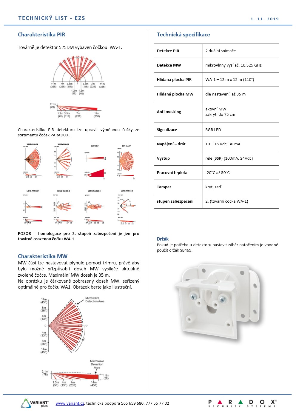 Duální detektor Vision 525DM má shodné vlastnosti jako PIR detektor Digigard 55 a je doplněn o další detekci - moderní mikrovlnný detektor. Oba principy detekce fungují v součinnosti a vzájemně se doplňují, navíc MW složka obsahuje i ochranu před nežádoucím zastíněním detektoru - ANTIMASKING. Zpracování obou signálů je plně digitální a umožňuje výrazným způsobem omezit vznik falešných poplachů.