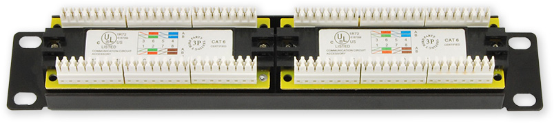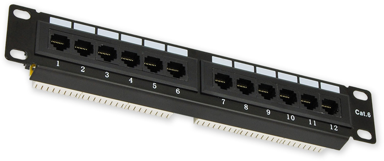 Patch panel do 10" datového rozvaděče s 12 porty Cat.6 UTP. Patch panel je vybaven zářezovými svorkovnicemi typu IDC 110, k zapojení vodičů je nutné použít nástroj pro tento typ svorkovnice.