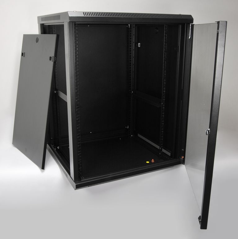 19“ nástěnný datový rozvaděč se skleněnými dveřmi a odnímatelnými bočnicemi, dodávaný ve složeném stavu. Stabilní montovaná konstrukce, skelet z ocelového plechu, černá barva. Vhodné pro malé sítě nebo koncová místa velkých sítí.