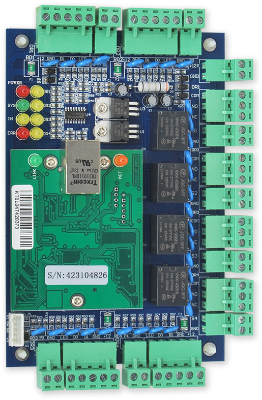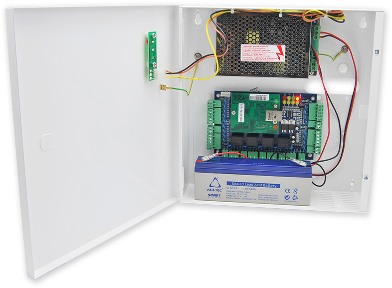 Řídící jednotka (v plechovém boxu s napájecím 3 A zdrojem) přístupu pro 4 dveře jednostranně nebo 2 dveře oboustranně. Řídící jednotka má čtyři výstupní relé pro ovládání zámku, je možné připojit 4 čtečky s výstupem Wiegand 26 bitů.
