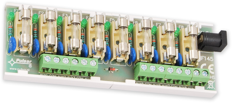 Přídavná rozbočovoací svorkovnice s 8x tavnou pojistkou 0,5 A. Napětí na výstupech je odděleně signalizováno LED.